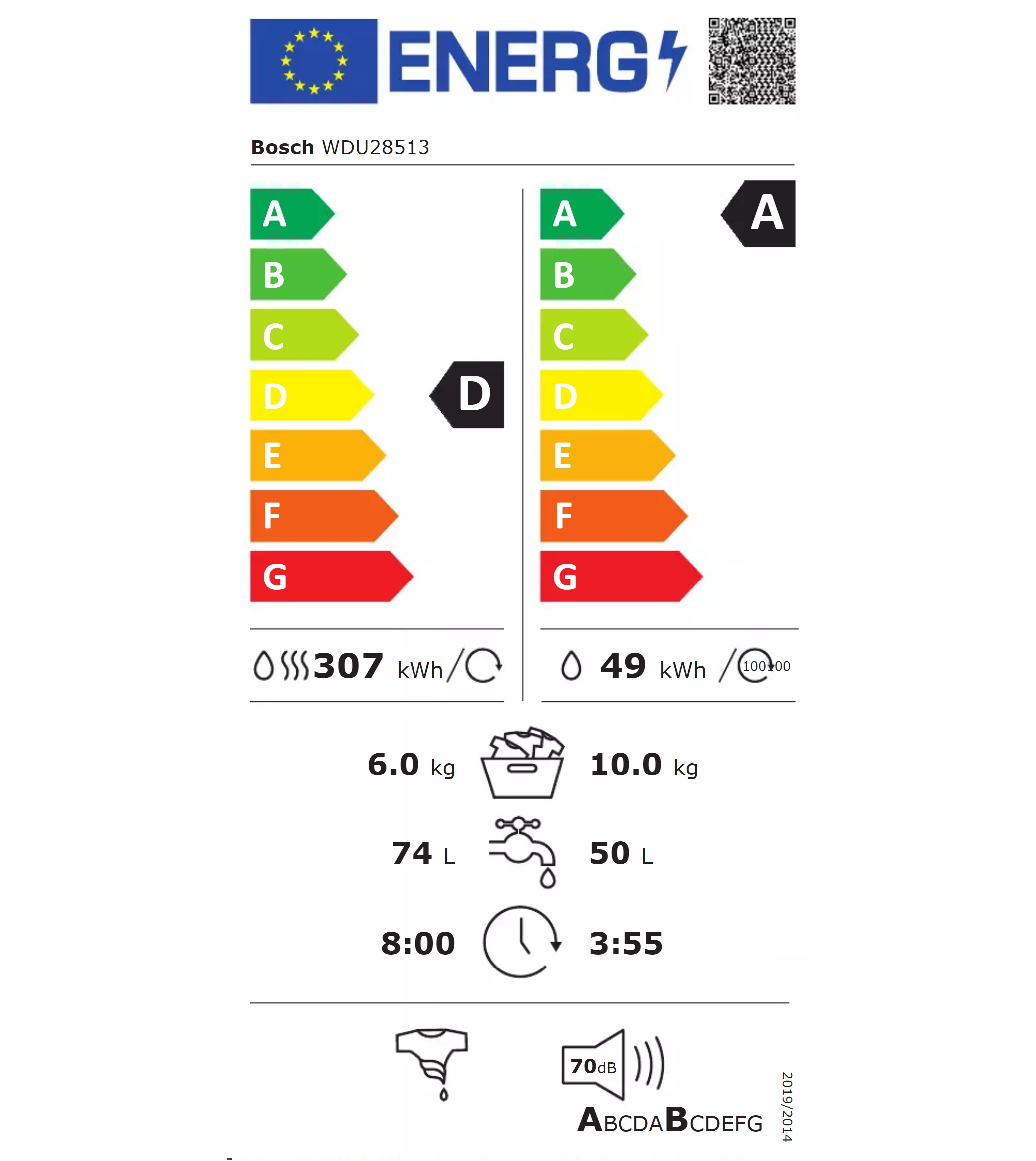 Потребление энергии, Стирка / Стирка&Сушка ...49/307 кВтч/100 циклов