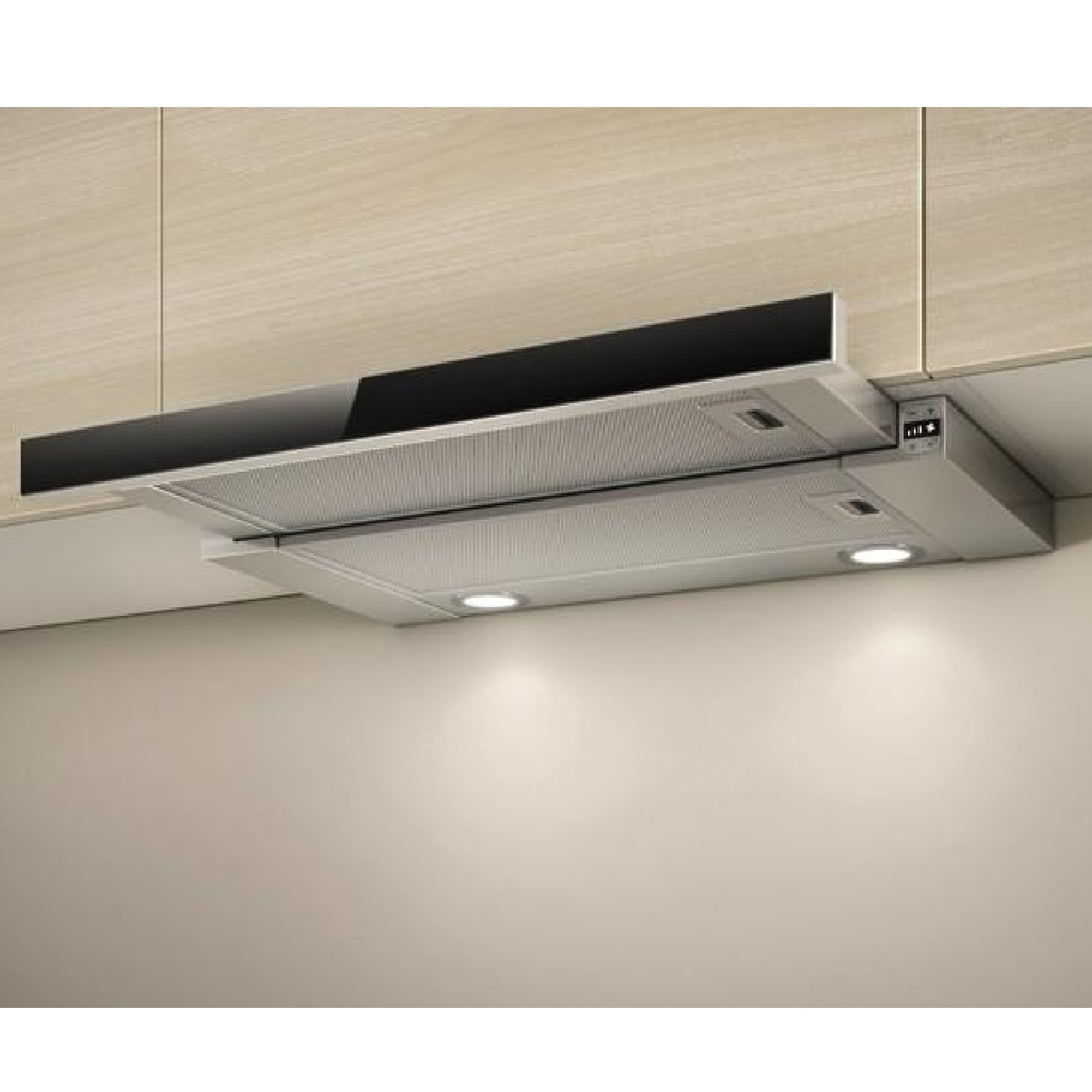 Устройство включается путем выдвижения передней панели. Переключатели Touch control гарантируют удобное управление тремя основными и одной интенсивной скоростями. Модель может работать в режиме отвода и рециркуляции. Вытяжка оснащена таймером с автоматическим отключением по истечении определенного срока; индикатором насыщения фильтра; дисплеем, на котором выводятся сведения о работе прибора.